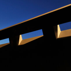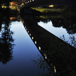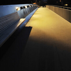 Der Bauwerksentwurf sieht vierzig Licht- und Sichtöffnungen im einseitig angeordneten Stahlträger vor. In diesen Öffnungen werden LED-Linienleuchten eingebaut und mit Abdeckungen aus Polycarbonat und einem Abdeckrahmen aus Stahl versehen. Im Bereich der beiden Auflager gibt es über eine Länge von zwölf Metern keine Lichtöffnungen, hier laden Holzbänke die Passanten zum Verweilen ein.